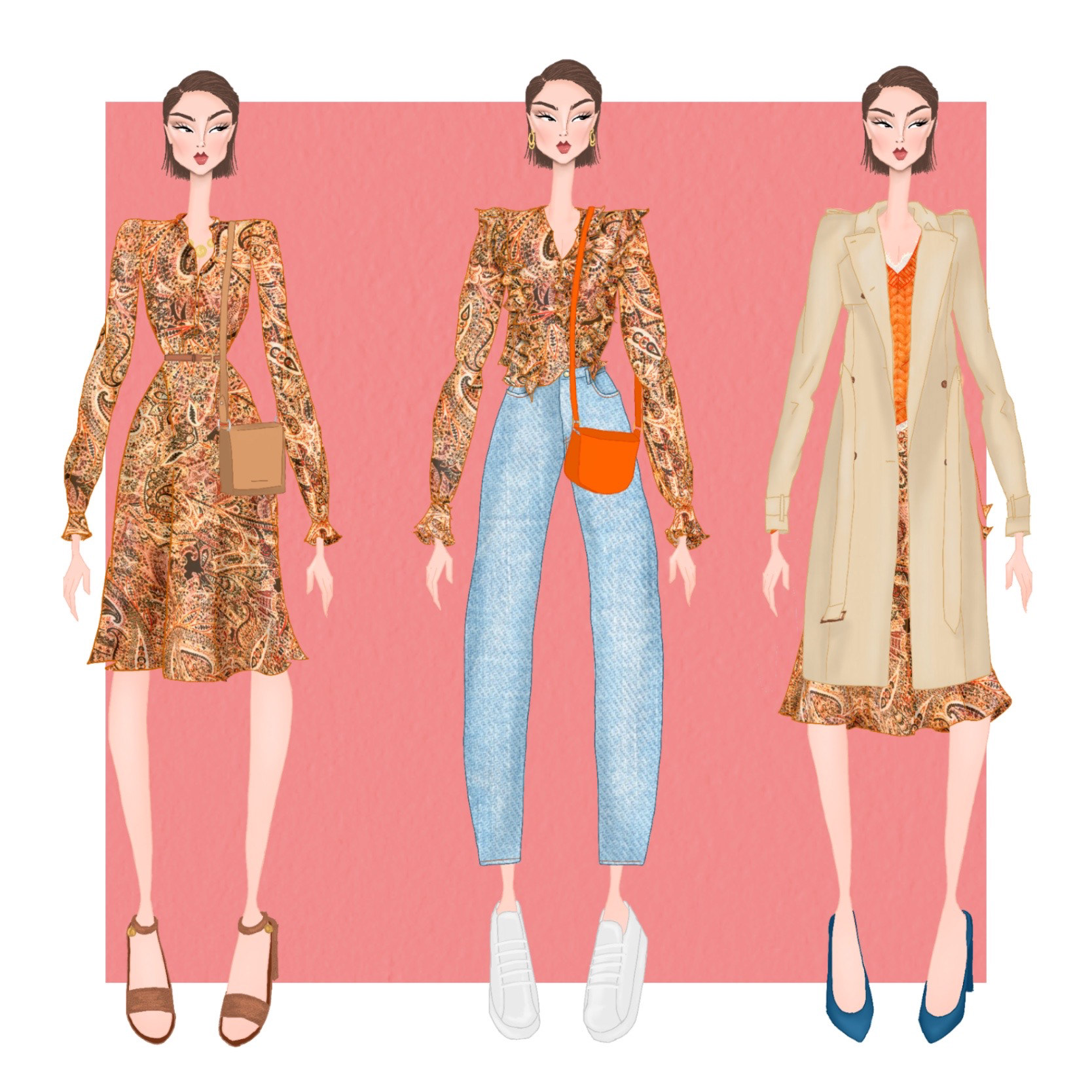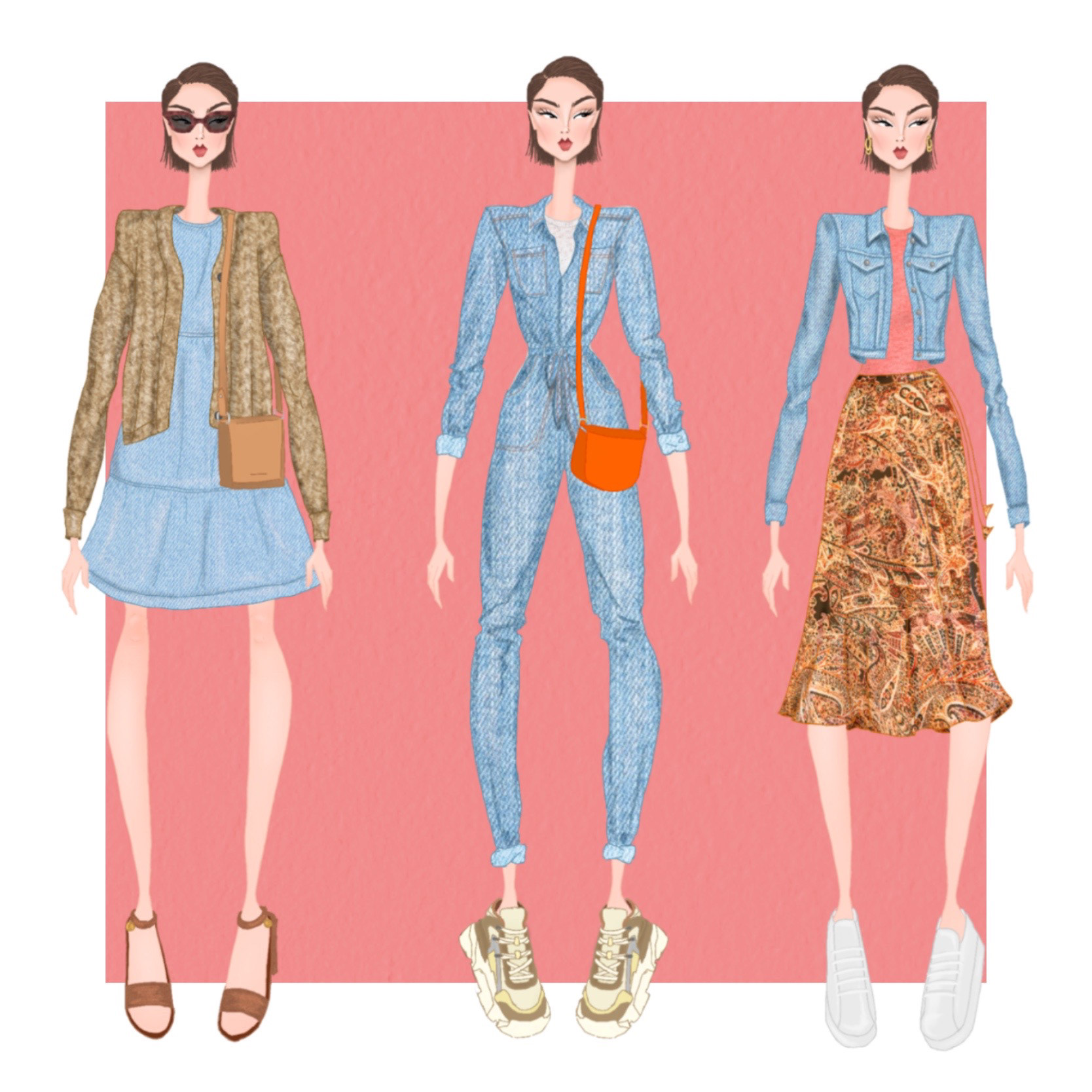 Taking inspiration from clothing used in advertising and found in store, I created a capsule wardrobe utilising trends for Spring/Summer such as 70s inspired paisley prints and unique denim pieces.